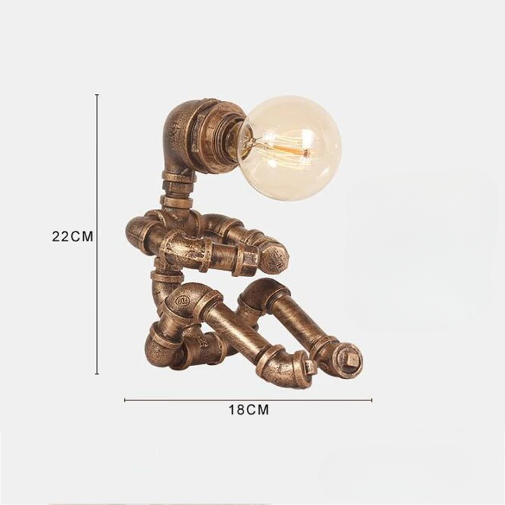Son esthétique distincte, avec ses tuyaux en bronze entremêlés en un design réminiscent d’une structure robotique ou mécanique, attire instantanément l’attention. Ce chef-d’œuvre de l’éclairage, aux finitions délicatement vieillies, apporte une touche d’originalité et d’élégance à votre intérieur. L’ampoule transparente, suspendue comme un bijou, illumine votre espace de sa lueur chaleureuse, tandis que les filaments visibles renforcent son allure retro. Cette lampe de table n’est pas seulement une source de lumière; c’est une véritable pièce d’art qui éveille un intérêt esthétique et fonctionnel.
