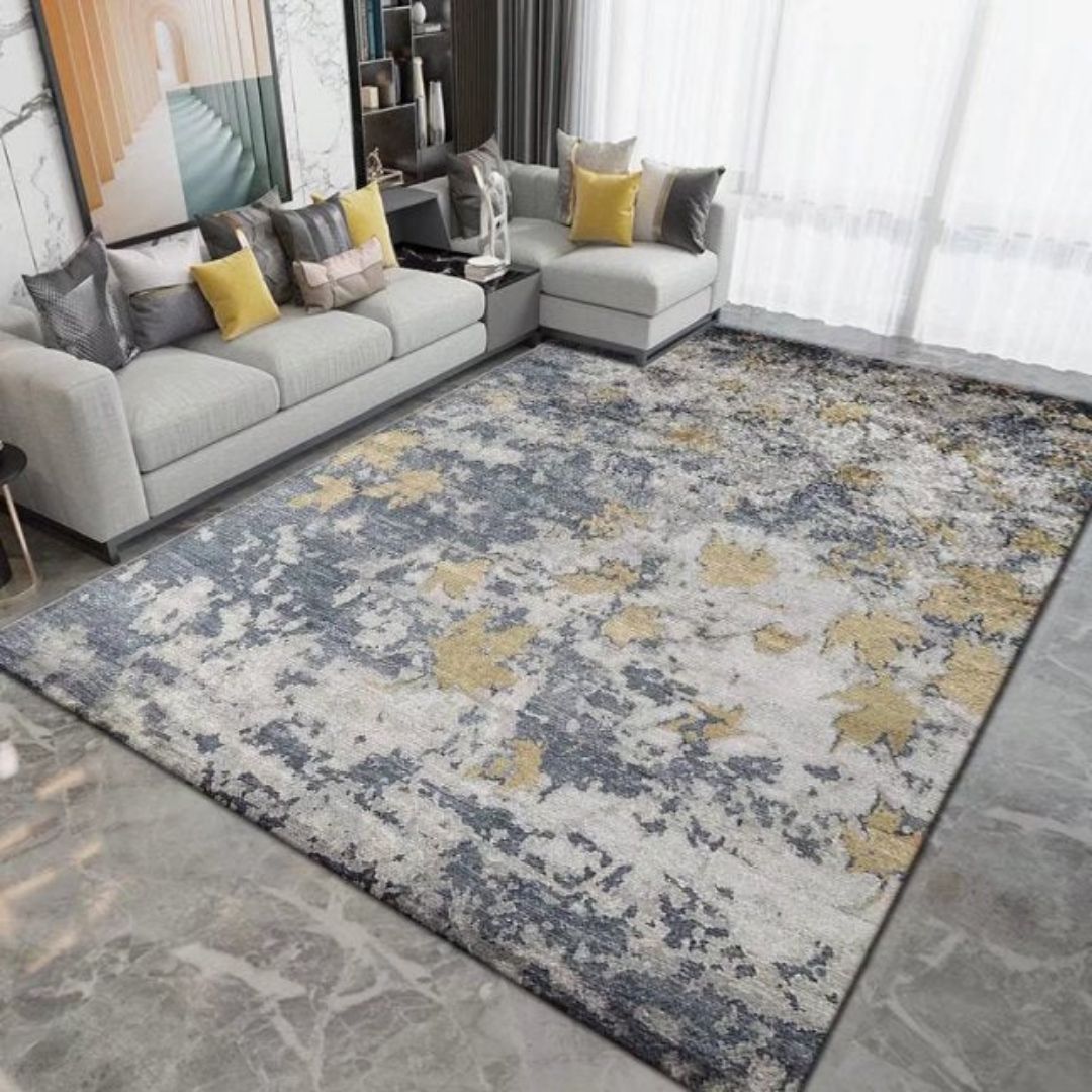 Notre magnifique tapis pour salon industriel aux nuances de gris et aux accents dorés est spécialement conçu pour s’adapter parfaitement à votre intérieur, en ajoutant une touche de luxe et de confort. Ce modèle unique s’accorde parfaitement avec un canapé gris et des coussins de couleur jaune.- Matériau : Polyester